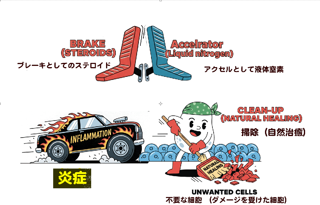 その理由を推測を続けて辿り着きました。「先にリンゴが落ちました。」その理由を考え続けたことでこの知見に至りました。その「新しい視点」から見るこれまでの皮膚科治療や病態は違って見えてきます。スプレー式液体窒素という、本来は組織を破壊(焼灼)するために使われる強い刺激が、