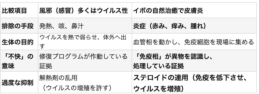 これが、長年治らずに悩んできた患者さんを笑顔にしてきた、当クリニックの答えです。 B.自然治癒反応の経過 「見せかけの軽快」という罠 ウィルスが関係して感冒と皮膚炎は似ている C,不幸な事 3つ D