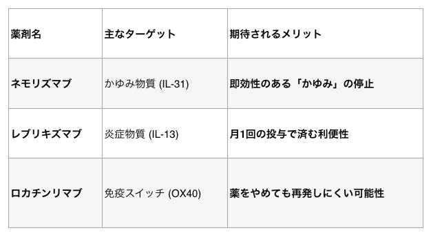 内容: 2025年にかけて普及が進んでいる新薬で、通院や自己注射の手間を減らしつつ、高い皮膚改善効果を維持できる「タイパ(タイムパフォーマンス)」の良い薬として期待されています。